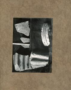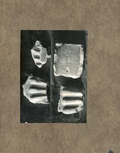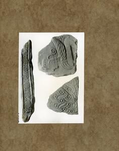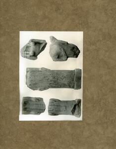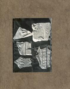 Part of the collection of images, 1924-1927, of the British School at Athens excavations at Sparta, Laconia. The original description in the SPHS register reads: "Sparta, Acropolis & Heroon. Moulded pithoi fragments; Three: one a sphinx, one a handle".