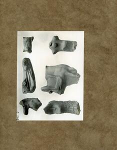 Part of the collection of images, 1924-1927, of the British School at Athens excavations at Sparta, Laconia. The original description in the SPHS register reads: "Sparta, Acropolis 1924-27. Terracottas. Six: 2 horses' heads, gryphon & fragments".