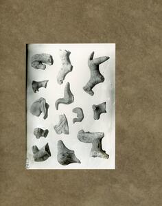 Part of the collection of images, 1924-1927, of the British School at Athens excavations at Sparta, Laconia. The original description in the SPHS register reads: "Sparta, Acropolis 1924-27. Terracottas. Thirteen: animals, birds, &c.".