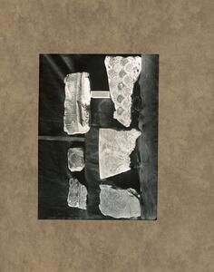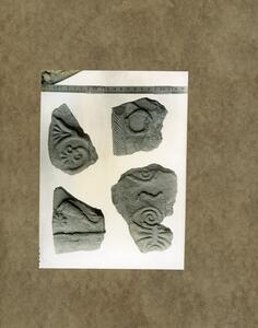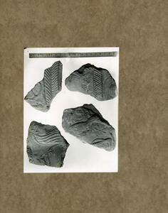 Part of the collection of images, 1906-1910, of the British School at Athens excavations at Sparta, Laconia. The original description in the SPHS register reads: "Sparta, Orthia site. Five fragments of siclke-dedication, showing ornament of stelai".