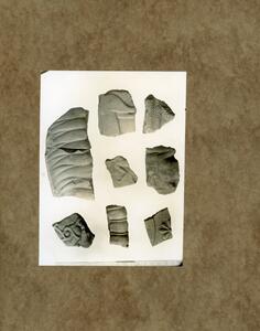 Part of the collection of images, 1906-1910, of the British School at Athens excavations at Sparta, Laconia. The original description in the SPHS register reads: "Sparta, Orthia Site 1906-10. Architectural terracottas: antefix tiles, with incised 'inscriptions', three fragments".
