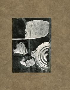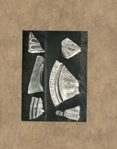 Part of the collection of images, 1906-1910, of the British School at Athens excavations at Sparta, Laconia. The original description in the SPHS register reads: "Sparta, Orthia Site 1906-10. Architectural terracottas: six pieces of disc acroterion with scale-pattern".