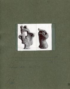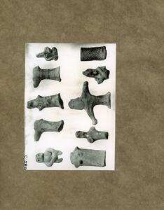 Part of the collection of images, 1924-1927, of the British School at Athens excavations at Sparta, Laconia. The original description in the SPHS register reads: "Sparta, Acropolis 1924-27. Terracottas. Ten - primitive and grotesque".