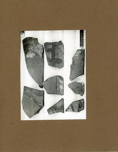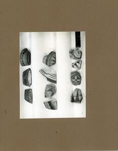 Part of the collection of images, 1924-1927, of the British School at Athens excavations at Sparta, Laconia. The original description in the SPHS register reads: "Sparta 1924-27, Acropolis. Pottery, Laconian III-IV. thirteen fragments".