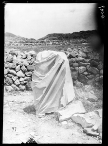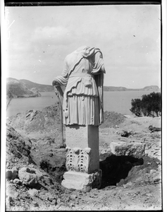 Part of a group of images from explorations and excavations on the island of Melos conducted by the British School at Athens from 1896 to 1899. The original description in the SPHS register reads: "Melos: Tramythia: statute of hierophant, front view".