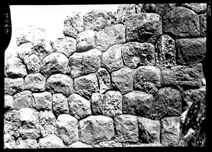 Part of a group of images from explorations and excavations on the island of Melos conducted by the British School at Athens from 1896 to 1899. The original description in the SPHS register reads: "Melos: Town wall polygonal at gate".