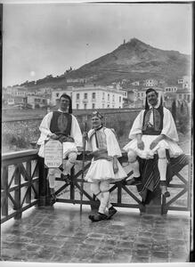 One of a group of images relating to the British School at Athens: buildings and setting, scholars and students. The original description in the SPHS register reads: "Members of the B. S. A. in fustinella".