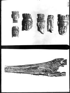 Part of the collection of images, 1906-1910, of the British School at Athens excavations at Sparta, Laconia. The original description in the SPHS register reads: "Sparta: (a) model of temple (b) fragment of horse limestone relief".