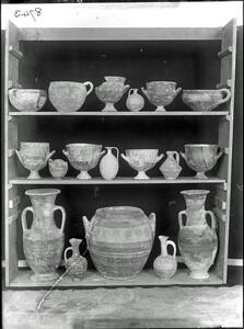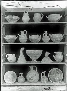 Part of a group of images from the British School at Athens excavations at Palaikastro, Crete in the 1902-1905. The original description in the SPHS negative register reads: "Palaikastro: late Minoan vases".