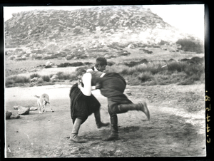 Part of a group of images from the British School at Athens excavations at Palaikastro, Crete in the 1902-1905. The original description in the SPHS negative register reads: "Palaikastro: a festival. Wrestling on the beach".