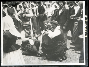 Part of a group of images from the British School at Athens excavations at Palaikastro, Crete in the 1902-1905. The original description in the SPHS negative register reads: "Palaikastro: a festival. The poet improvising".