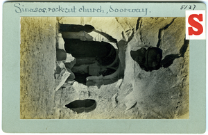 Part of a collection of images from Dawkins' travel to Cappadocia and Pharasa between 1909 and 1911. The original description in the SPHS register reads: "Rock cut church between Sinasos & Urgub (detail)".