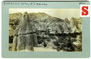 Part of a collection of images from Dawkins' travel to Cappadocia and Pharasa between 1909 and 1911. The original description in the SPHS register reads: "Sinasos: valley of S. Nicolas".