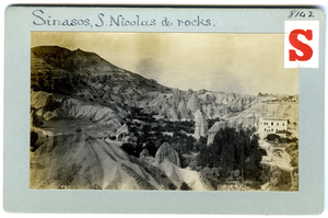 Part of a collection of images from Dawkins' travel to Cappadocia and Pharasa between 1909 and 1911. The original description in the SPHS register reads: "Sinasos: S. Nicolas & rocks".
