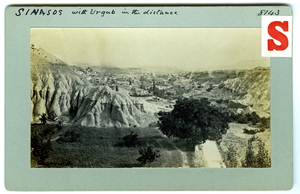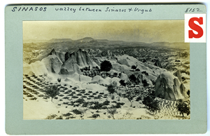 Part of a collection of images from Dawkins' travel to Cappadocia and Pharasa between 1909 and 1911. The original description in the SPHS register reads: "Sinasos: with Urgub in distance".