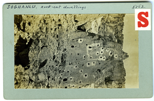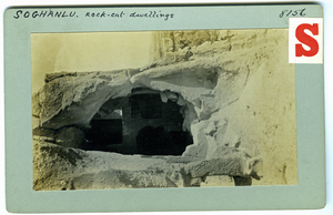 Part of a collection of images from Dawkins' travel to Cappadocia and Pharasa between 1909 and 1911. The original description in the SPHS register reads: "Rock cut dwellings of Soghanlu".
