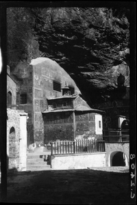 Part of a collection of images from Dawkins' travel to Pontus to investigate dialects in 1914. The original description in the SPHS register reads: "Monastery of Soumela, the painted church, near Trebizond".