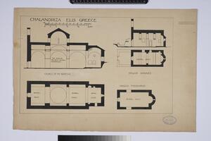 Longitudinal section and ground plan of the Koimesis church - Longitudinal section and ground plan of the Hagios Ioannis church - Ground plan of the Hagioi Theodoroi church. The drawing is entitled in ink: 'Chalandriza Elis Greece'. It is labelled in ink: 'Church of the Koimesis'. 'Hagios Ioannis', Hagios Theodoros'. Further annotation in ink survives.
