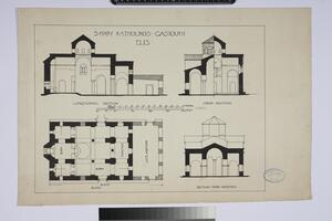 Upper row: Longitudinal section (left) - Cross section (right). Lower row: Plan (left) - Section through narthex (right). The drawing is entitled in ink:'S. Mary Katholikos Gastouni Elis'. It is labelled in ink: 'Longitudinal Section', 'Cross Section', 'Plan' and 'Section through Narthex'.