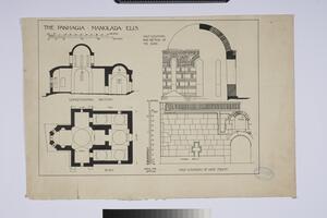 Plan (restored). This is a printed version of an original drawing. It is entitled in pencil: 'S. Mary Panachrantos Constantinople - Restored Plan'. It is annotated in ink. A preliminary sketch of the church in pencil survives to the right.