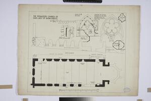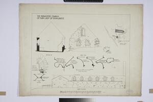 Cross section - West elevation - Sketch and Plan of window gables - Sections of vault ribs, cornices, stringcourses, details of arches - Fragment of moulding and a north elevation. A sketch plan of the site survives in the upper right-hand corner. The drawing is entitled in ink: 'The Monastery Church of our Lady of Isova Greece'. Further annotation in ink survives.