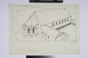 Ink drawing of restoration of the Monastery of our Lady at Isova. The drawing is labelled in pencil: 'The Monastery of Our Lady of Isova. Restored Sketch'.
