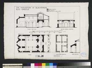 Upper rwo: Longitudinal section (left) - Cross section. The drawing is entitled in ink: 'The Monastery of Blachernai Elis Greece'. It is labelled in ink: 'Long Section', 'Section across Narthex', 'Plan', 'Plan over Narthex', 'Cross Section'.