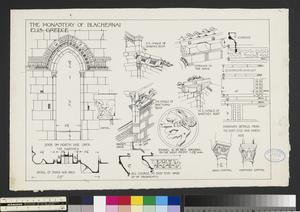 Details of the narthex door, the roof, capitals, cornices, sculpture and masonry. The drawing is entitled in ink: 'The Monastery of Blachernai Elis Greece'. It is labelled in ink: 'Door on North Side over the Narthex', 'Detail of Jmb and Arch', 'SE Angle of Narthex Roof', 'SE Angle of Sanctuary Roof', 'Roundel in an Arch Spandril on the West Front', 'Sill Course at East End made up of Fragments', 'Cornice to the Nave', ' NE Angle of Narthex Roof', 'Masonry Details from the East End and North Side', 'Nave Capital', 'Narthex Capital'.