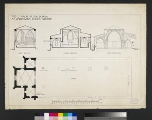 Upper row: Longitudinal section, Cross section, West elevation. Lower row: Ground plan. The drawing is entitled in ink: 'The Church of Sta Sophia at Andravida in Elis Greece'. It is labelled In ink: 'Long Section', 'Cross Section', 'West Elevation'. Further annotation in ink survives.