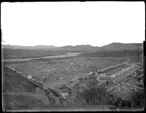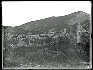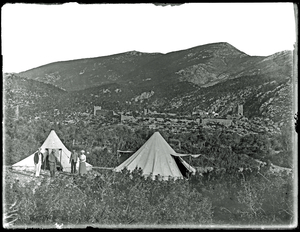 Part of a series of images from the British School at Athens excavations at Aegosthena, led by E.A. Gardner and BSA student, E.F. Benson in 1894/95. The original description in the SPHS register reads: "Aegosthena: general view from N.W. with Prof. Gardner's camp in foreground". The entry has been struck out in the SPHS register, presumably deaccessioned.