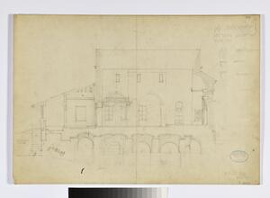 East elevation. This is a preliminary drawing. It is signed ('W. Harvey' ) in pencil in the lower right-hand corner. Further annotation in pencil survives.