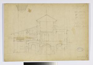 Transverse section looking west. This is a preliminary drawing. It forms part of a series: No 5 is inscribed in pencil in the upper right-hand corner. It is entitled in pencil: 'Ike Scherefee, Cross Section Looking West'. Further annotation in pencil survives.