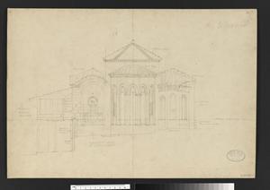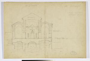 Transverse section. This is a preliminary drawing. It is entitled:'Mosque of Yacoub Pasha', 'Section Looking East'. Further annotation in pencil survives.