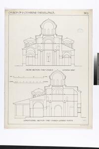 Transverse section (top) - Longitudinal section (bottom). This is a preliminary drawing.It is entitled: 'Church Of S. Catherine Thessalonica', No 3. It is labelled: 'Cross Section Through Church Looking East' and 'Longitudinal Section Through Church Looking North'.