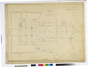Plan of the crypt. This is a preliminary drawing. It forms part of a series: No 3 is inscribed in pencil in the upper right-hand corner. It is entitled in pencil: 'Ike Scherefee, Plan of the Lower Church'. Further annotation in pencil survives.