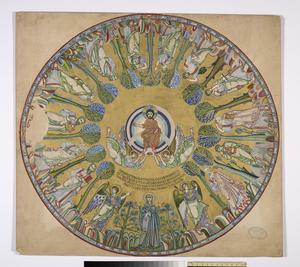 Dome - The Ascension (detail). The mosaic decoration in the dome is dated to the late 9th c. The drawing forms part of a series: No 3 is inscribed in gold in the lower left-hand corner. It is initialed (W.H.) and dated (1908) also in gold in the lower right-hand corner.