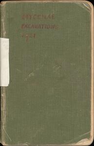 Notebook recording the progress of the excavation and information about finds in both the 1921 and 1922 seasons. Lamb records areas she is excavating from May-June 1921 including the fresco area, the NW slope, various rooms in the Palace (Megaron), Terrace of the Pithoi, the Court and some of the Tholos Tombs. She writes in detail about the frescoes in the Palace. She also has written excerpts from publications relevant to her work in Mycenae. Her recordings in May-June of 1922 focus more on the tombs of the Kalkani cemetery.