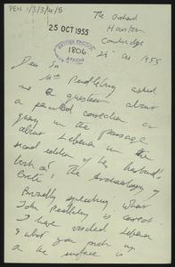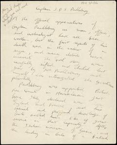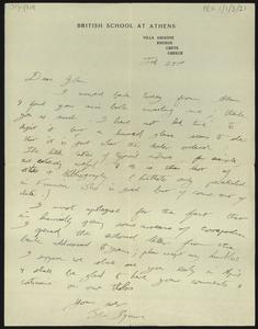 Sent from Villa Ariadne. Thanking Pendlebury for a copy of [‘The Archaeology of Crete’], commenting on the book, forwarding a letter for Pendlebury that he had accidentally opened, and mentioning that he would see Pendlebury in April and would like to have his comments on “our Tholos” [perhaps tholos tombs on the southern slopes of Koprana, near Karphi, Crete].