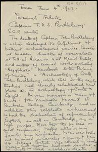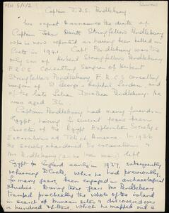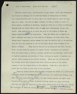 Comprises a 2nd draft copy of ‘Travels in Crete’ (PEN 2/4/3/4) with different annotations. Photographs have also been added to illustrate the trips. The account of a journey “Trip to Eleutherna and Preveli May 3rd – May 10th 1929” is annotated as having been published in Archaeology Magazine (Sep 1964). The wording of the draft and later publication is exactly or almost exactly the same. 32 photographs which included as illustrations are [later prints] of photographs in photograph albums of Crete (PEN 7/2/5 and 7/2/6). 1. “Skalani: Sta Seraia” (PEN 7/2/5/87). 2. “Bridge over the Kartero below Aitania” (PEN 7/2/5/88). 3. “Skoteino Cave and Church” (PEN 7/2/5/94). 4. “Fountain at Krasi” (PEN 7/2/5/113). 5. “Gorge between Krasi and Mallia” (PEN 7/2/5/117). 6. “View between Sisi and Milatos” (PEN 7/2/5/124). 7. “Imperial Airways yacht and plane” [near Axos or Naxos Hill], (PEN 7/2/5/158). 8. “Leper Island” (PEN 7/2/5/164). 9. “Fort on Leper Island” (PEN 7/2/5/172). 10. “Armyro” [Yeoryioúpolis], (PEN 7/2/4/259) 11. “Palaikastro Rodias” (PEN 7/2/5/258). 12. “Agia Pelagia” (PEN 7/2/5/259). 13. “Sysi from above” (PEN 7/2/5/260). 14. “Bay East of Bali” (PEN 7/2/5/261). 15. “Bali Bay” (PEN 7/2/5/262). 16. “Bali” (PEN 7/2/5/263). 17. “Plain of Arkadi” (PEN 7/2/5/264). 18. “Sybrita from the North” (PEN 7/2/5/267). 19. “Ancient Walls, Sybrita” (PEN 7/2/5/268). 20. “Monastery of Odhighitria” [gatehouse] (PEN 7/2/6/448). 21. “Site of Laseia” [Lebena] (PEN 7/2/6/462). 22. “Cape Leon” [Gorge below Krotos], (PEN 7/2/6/464). 23. “Koudouma Monastery from the West” (PEN 7/2/6/471). 24. “Koudouma Monastery” [the acting abbot] (PEN 7/2/6/473). 25. “Tsoutsouro” (PEN 7/2/6/484). 26. Panorama of Tsoutsouro (PEN 7/2/6/482-485). 27. “Top of Khaos Gorge” (PEN 7/2/6/748). 28. “Top of Stavroménos”, Hilda Pendlebury with Martin and Molly Hammond (PEN 7/2/6/750). 29. “Loading up at Psarais” (PEN 7/2/6/753). 30. “Site at Kastri” (PEN 7/2/6/755). 31. “Goulas Gorge” (PEN 7/2/6/759). 32. “View West from Agios Ioannis” (PEN 7/2/6/760).