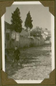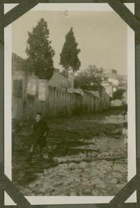Photograph taken by [Hilda] White. Scene includes a boy standing in the road.