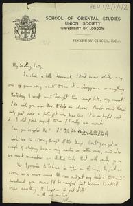 On headed paper from the School of Oriental Studies Union Society, University of London. Sending Hilda a document (relating to their forthcoming marriage), telling her he had bought camp beds [for their honeymoon] and asking her to get sleeping bags and a torch, asking her to decipher [hieroglyphs] and promising to "behave in and/or on the sea".