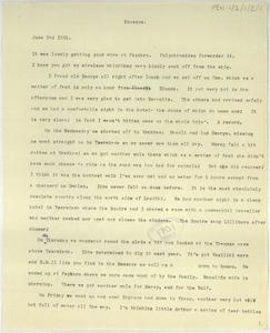 Thanking Hilda for letters and news; giving her news of the excavation including details of finds, that the weather had been very poor and volcanoes were predicted for the 17th [of June]; describing the house that had been built [at Tzermiado] including the furnishing and that they had held a dance on the roof; telling Hilda about his walk to Knossos to fill in/send an income-tax form and “old Louka” accompanying him on the return journey; and discussing a review of [‘The Archaeology of Crete’] by Theophanidus, John’s criticisms of an article about Tell el-Amarna, and receiving an article by James Strachey who John had met at “the Exhibition” [British School or Egypt Exploration Society Exhbition].