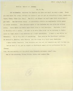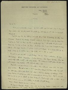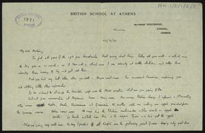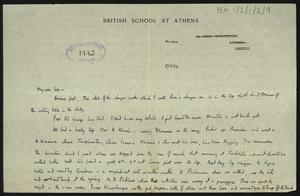 Thanking Hilda for notes, letters and papers; informing her that he was going to Kimolos [Kímolos, Nísos] and Syros [Sýros, Nísos] for a week from the following day, and that he had been to Thorikos and Markopoulo where he was “embraced by a tight Agrophylax”; news of people he had seen in Athens (Hill, [Carl] Blegen, Marinatos, Karousos, Miller, “Peche Melba”, Emile); sending the Heurtley’s address near Stroud (United Kingdom); informing Hilda he was going to play hockey and that one of the [British School] students (Vronwy Fisher) knew her nephew Jim; checking that Hilda was sending out a publication proof that [John] Forsdyke had returned and asking that she let him know when she received his report on an essay by Stubbings and his job application for the Disney [Professorship of Archaeology at the University of Cambridge].