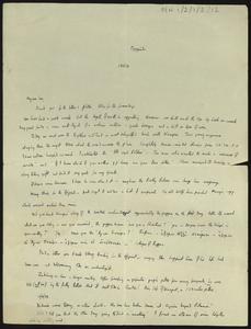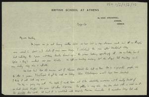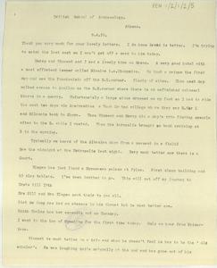 Hoping that Hilda had received a telegram announcing that John had arrived in Knossos and that [David and Joan] had cards from him, and updating Hilda on his activities and news: having received a mysterious letter from the French School [in Athens] containing a carol service programme from Pembroke College and a letter from a bank manager to Mr Bayley; his trip to Pylos [Pílos] and Mycenae; news about [friends at Mycenae] Helen, Agamemnon, Costa, and asking Hilda if she got a “party spirit post card” signed by old Gianoula; a trip to Kalamata [Kalámai] and Pylos [Pílos] with Vincent [Desborough] which included seeing [Carl] Blegen’s excavation of a palace at Pylos [Pílos]; details of Blegen’s excavations; travelling back to Athens from Kalamata [Kalámai] then on to Knossos; work done in the museum at Knossos; hoping to go to Grabusa with Mercy [Money-Coutts] and the Squire [R W Hutchinson], then on to Lasithi [Lasíthi] in a month; and seeing the tholos [at Knossos] and doubting the dating. John also asks Hilda for her original pottery notes and sends love from “everyone, particularly Manoli”.