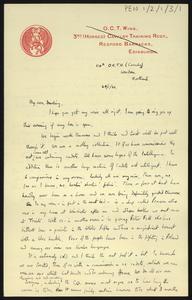 Comprises a letter, written whilst on guard duty, describing John’s training on horses, that he was feeling better and that it had been a good party at the weekend, and asking Hilda to send a shaving mirror and boots. Also includes mention that John was glad to get Hilda’s telegram, and asking her to let him know about train times to Cambridge and if she heard from Northampton.