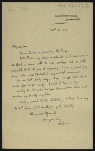 Written from St George’s School, Broadstairs, Kent. Hoping that she and [Herbert Pendlebury] were better, saying that he had written to Granny to thank her for a [birthday] present, and discussing a lecture they had on Canada. Includes news about the weather; that they had seen boats, submarines, a wreck and two mines explode; and that they had watched a [football] match that Malcolm’s brother played in. John asks Lillian to send a book about the British Army, writes that “the Imperial [cat] has begun to scratch” (with a picture of a cat), and hopes that Dicky and the love birds are well.