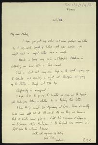 Telling Hilda about a trip around Western Crete with Mercy [Money-Coutts] and the Squire [R W Hutchinson] (to Khania [Chania], Kiramos, Trakhila/Selli, Agios Sostes, Gravousa, Phalasarna, Platanos, Polysslenia, Rokka, Kolympari and Khomia). That Naxakes had joined them for part of the journey and had been “an extremely pleasant companion”, and that Mercy and John had been mistaken for spies. John also thanked Hilda for a review from [the Illustrated London News] and told her where a stub for a check for Rex was, informed her that “poor old George” [Markogiannakis] had died, and that he had enjoyed getting David’s letter.