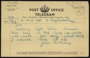 Thanking Hilda for a telegram, telling her that all is well there and that Khronis, Kosti, Manoli and Maria [in Crete] sent love to Hilda, David and Joan.