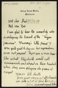 Sent from the British School at Athens. Telling Herbert they had stayed in Athens and not travelled to Andros [Ándros] as planned because of bad weather, that Mrs Payne [Dilys Powell] was giving a lecture to the Anglo Hellenic League on Modern English Literature, and he had been teaching Hilda, [Nicholas] Hammond and Wason to fence. Thanking Herbert for sending books and asking if he had read one of them by Spearing; saying he’d received a copy of ‘Aegyptiaca’ but had not yet got a packet of prospectuses [of ‘Aegyptiaca’] and a cutting from a journal about Egypt; and mentioning an earthquake in Crete that he had been “wiring frantically” about to reassure [Arthur] Evans.