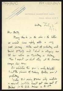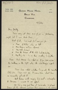 Written from Beaudesert Park, Henley-in-Arden. Seems to be unfinished. News about a cricket match (in which John had hurt his hand), that Mrs Pilkington had visited and he had received a letter from Mr Egerton [whose school John had previously attended]. Asking Lilian if she had got him another book by [Henry] Rider Haggard, whether she had seen any [German aircraft] the previous day, how the birds were and where she had decided to go (possibly to Stratford). John also mentions that it is only 3 weeks [until the summer holidays].